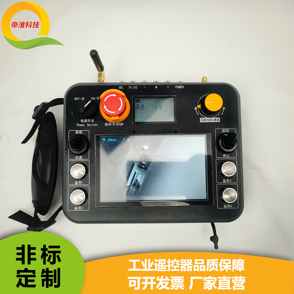 • 3个双轴摇杆+8个按键+1个两档旋转开关+1个5档旋转开关7寸触摸屏平板型工业无线??仄?/div>